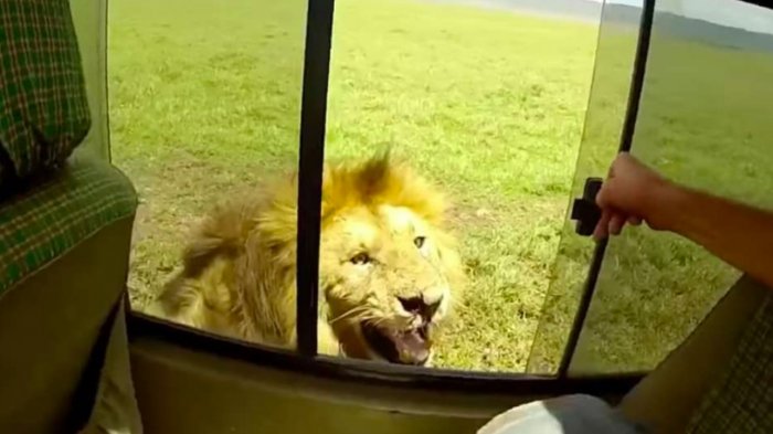 Turis mencoba menyentuh kepala singa dari dalam mobil hingga hewan liar tersebut bereaksi.