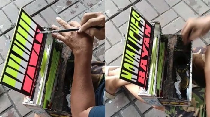 Pria yang namanya tidak diungkapkan itu terlihat bekerja melukis papan di pangkuannya dengan kuas dan cat hitam.