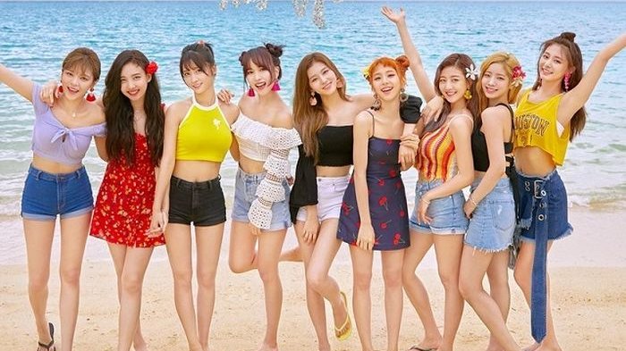 Para anggota TWICE mengenakan outfit khas musim panas.