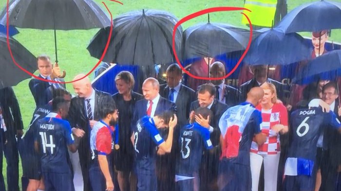 Tak ayal, saat prosesi tersebut, pihak-pihak yang berada di mimbar penyerahan trofi dan medali, seperti Presiden FIFA Gianni Infantino, Presiden Rusia Vladimir Putin, Presiden Kroasia Kolinda Grabar-Kitarovic, dan Presiden Perancis Emmanuel Macron, kehujanan. Meski ada beberapa orang yang mencoba memayungi mereka.