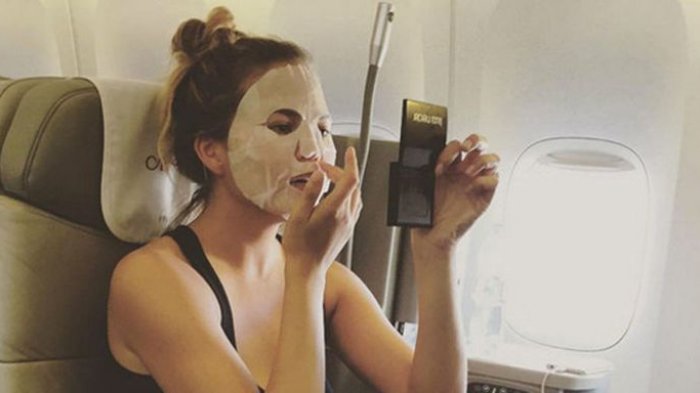 Jika kita melakukan perjalanan yang panjang, kita bisa memakai sheet mask untuk membuat kulit tetap lembap.