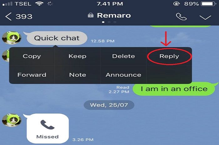 Mengklik 'Reply' maka pesan tersebut akan terkutip di atas kolom tempat kamu mengetik pesan.