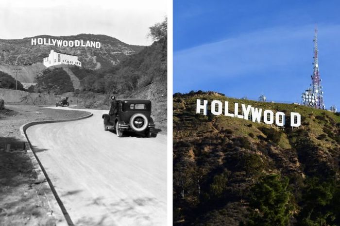 Tanda itu awalnya bertuliskan "Hollywoodland”, tetapi ketika Hollywood Chamber of Commerce mengembalikan sisa tanda pada tahun 1949, mereka memilih untuk menjatuhkan empat huruf terakhir.