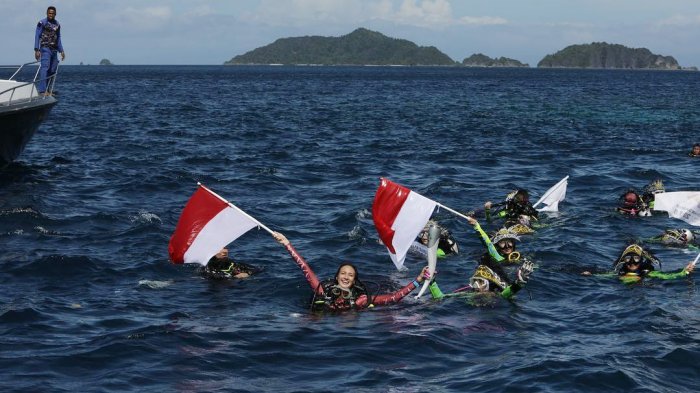Perkumpulan Wanita Selam Indonesia membawa obor ini menyelam di Pulau Piaynemo di Raja Ampat.