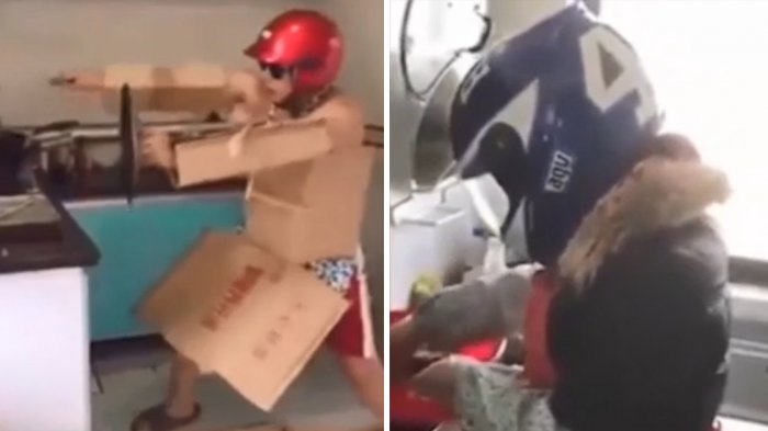 Mereka mungkin belum ahli memasak, tapi aksi mereka bisa jadi contoh kocak agar aman dari cipratan minyak.