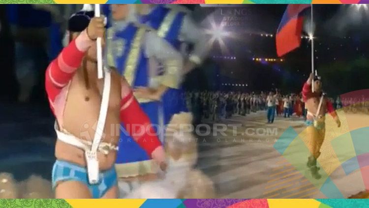 Pembawa bendera yang mengenakn kostum unik tersebut ternyata adalah seorang atlet gulat gaya bebas Mongolia.