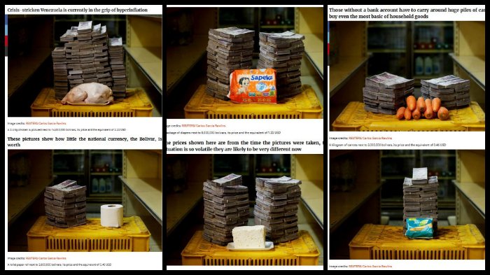 Untuk memberi gambaran tentang parahnya inflasi di Venezuela, fotografer Carlos Garcia Rawlins memotret beberapa gambar produk harian beserta uang tunai yang dibutuhkan untuk membeli barang tersebut.