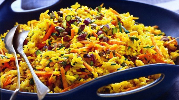 Pilaf adalah nasi yang dihidangkan dengan wortel, bawang, telur, dan daging.