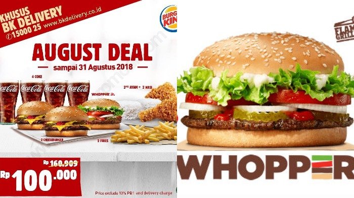 Promo spesial dari Burger King Indonesia ini berlaku hingga 31 Agustus mendatang dan hanya berlaku untuk pemesanan delivery via bkdelivery.co.id, call center (1500025), atau Facebook Chat.