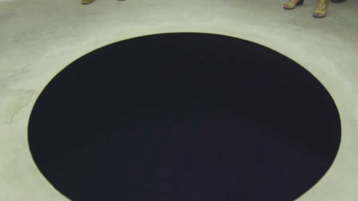 Si pria sedang menonton lubang yang dicat hitam, begitu pekatnya hingga terlihat tak berdasar, dan bertajuk Descent into Limbo.