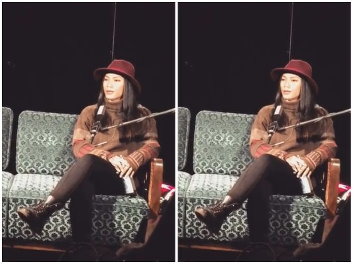 Ia mengenakannya saat tampil dengan atasan turtle neck yang dipadukan dengan knit cardigan, skinny pants, dan boots atau docmart favorit.