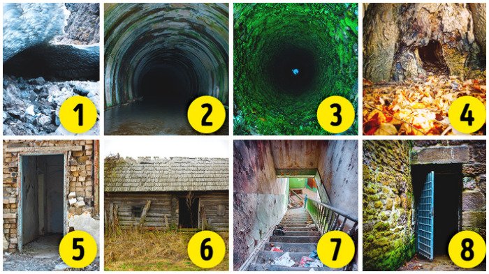 Caranya, kamu memilih satu dari delapan foto gua atau pintu di bawah ini yang paling membuat kamu takut memasukinya.