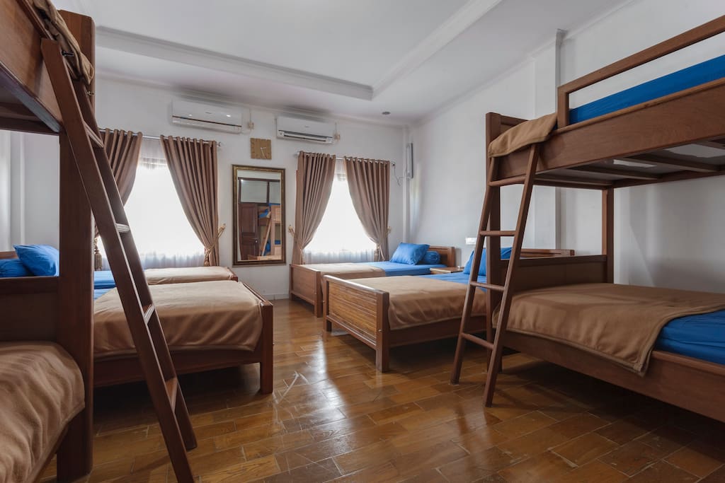 Konsep kamar minimalis modern dengan tempat tidur tingkat berbahn dasar kayu dan lengkap dengan fasilitas AC, dua sharing toilet, dapur, wifi, dan sarapan.