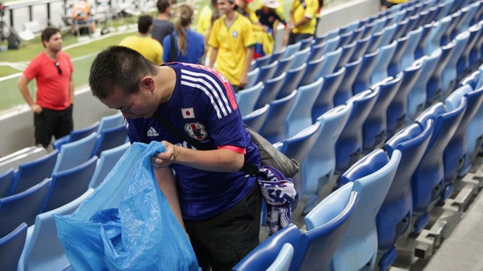 Sudah sejak lama suporter Jepang selalu membersihkan sampah baik timnasnya kalah atau menang.
