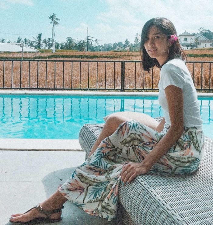 2. Paduan kaos putih polos dan long skirt motif floral beraksen slit ala Mikha Tambayong, bikin penampilan santai makin stylish dan fresh, ya!