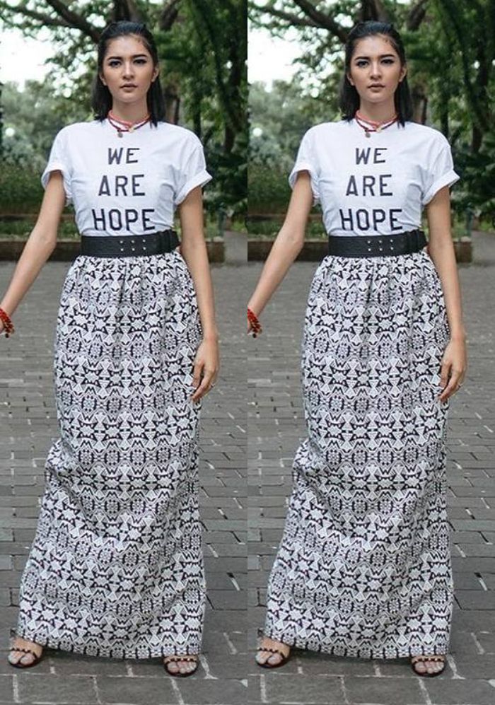 6. Biar penampilan enggak monoton, coba padukan kaos motif tulisan dengan long skirt bernuansa batik.