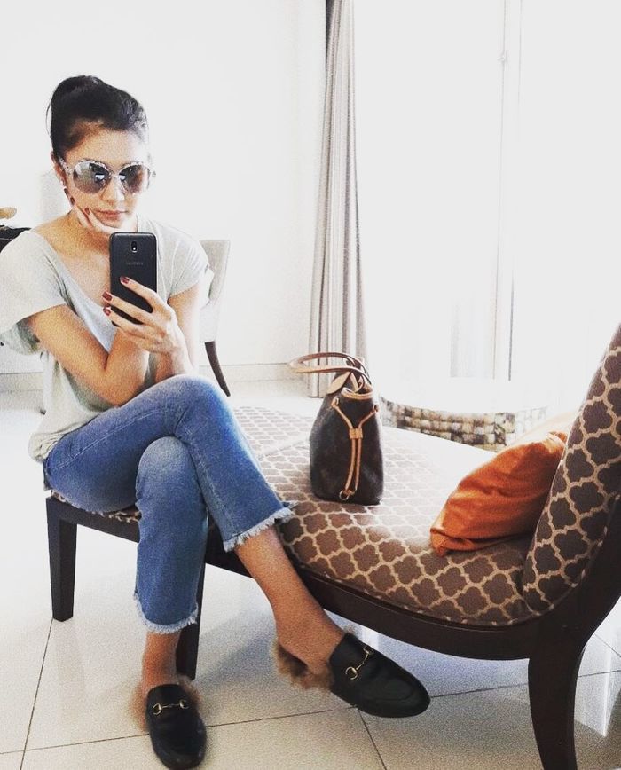 7. Paduan kaos warna netral, crop jeans beraksen frayed, dan sandal mules beraksen bulu bikin gaya simpel makin modis.