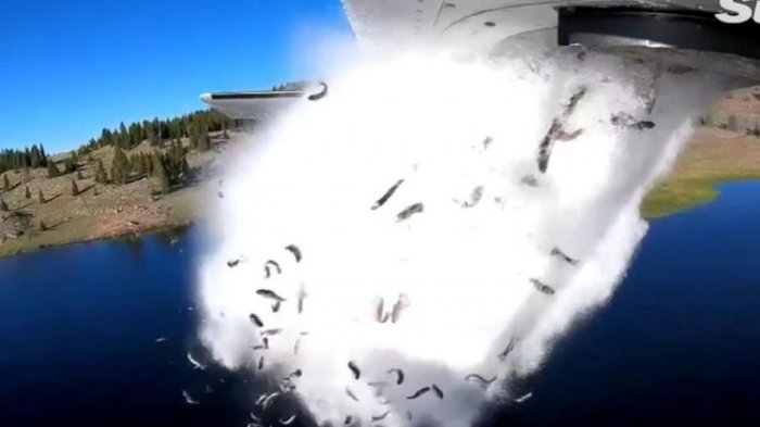Melalui akun resminya di Twitter, Divisi Sumber Daya Alam Liar Utah (DWR) mengunggah video penyetokan ikan ekstrem tersebut.