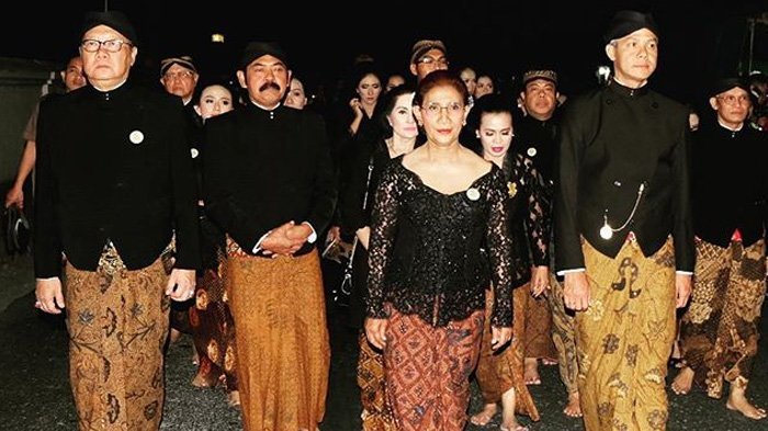 Mengenakan kain jarik dan kebaya hitam, Susi Pudjiastuti ikut melakukan kirab tanpa alas kaki.