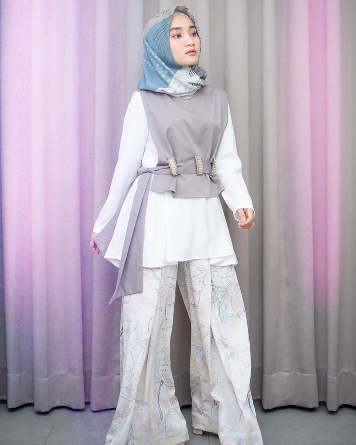 Nah, selanjutnya kamu tinggal menambahkan hijab bermotif dengan nada warna yang senada dengan celana kulot dan blus yang kamu kenakan agar lebih modis seperti Fatin Shidqia Lubis.
