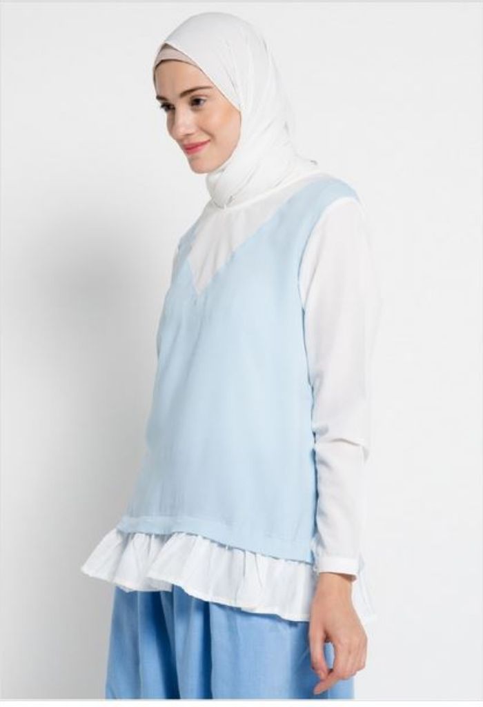 Desain rompi dan tambahan ruffles pada blouse tersebut akan membuat penampilan kamu akan terlihat semakin feminin dan modis saat celana kulot.