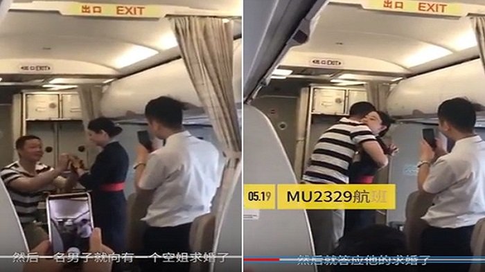 Dalam video tersebut terlihat seorang pria berbaju garis putih dan hitam dalam terlihat berlutut di depan pacarnya yang merupakan pramugari di maskapai China Eastern Airlines.