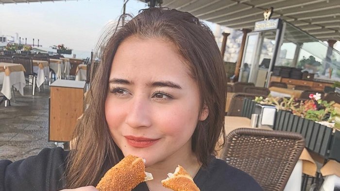 "Katanya orang sini belum lengkap rasanya kalau ke Turkey gak makan ini. Maafin rambut yang lepek dan acak-acakan ini... maklum... gak mandi! LOL," tulis Prilly pada akun Instagramnya @prillylatuconsina96.