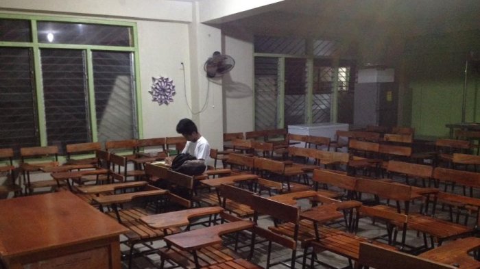 Siswa tersebut nampaknya memilih untuk mengerjakan PR sekolah karena tak ada listrik di rumahnya.