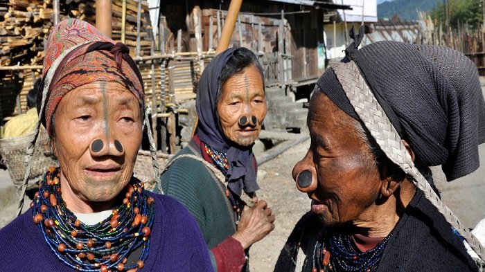 Wanita Apatani dianggap paling cantik jika mengenakan asesoris berupa lempeng bei untuk menyumbat bagian sisi kanan dan kiri hidungnya, kamu mau coba?