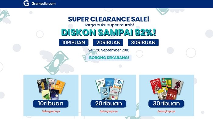 Diskon promo 'Super Clearance Sale' dari Gramedia ini berlaku mulai 24 -28 September 2018.
