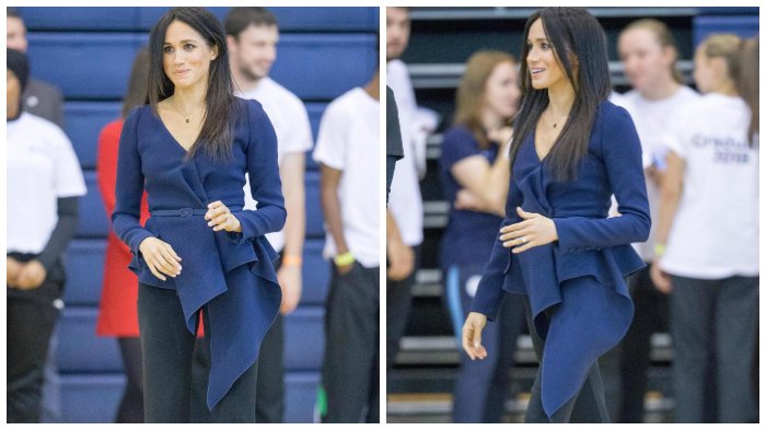 Saat kunjungannya di Loughborough di Leicestershire, Meghan justru mengenakan celana panjang hitam dan atasan berwarna biru navy.