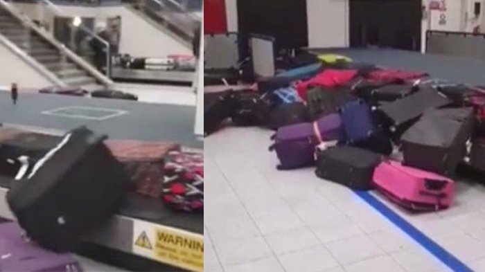 Video tersebut menunjukkan puluhan koper penumpang di Bandara Manchester, Inggris, terjatuh di lantai.