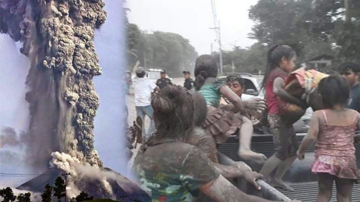Sementara dua foto memperlihatkan kepulan asap dari erupsi gunung berapi yang membumbung ke angkasa, serta anak-anak dan warga yang berlepotan lumpur.