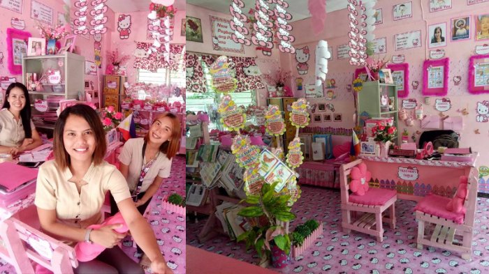 TRIBUNTRAVEL.COM - Samelyn Lafuente, Seorang guru sekolah dasar di Filipina menghabiskan setidaknya tiga tahun untuk mengubah ruangan kelas mengajarnya yang biasa menjadi penuh dengan dekorasi yang bertemakan Hello Kitty yang dominan berwarna pink.