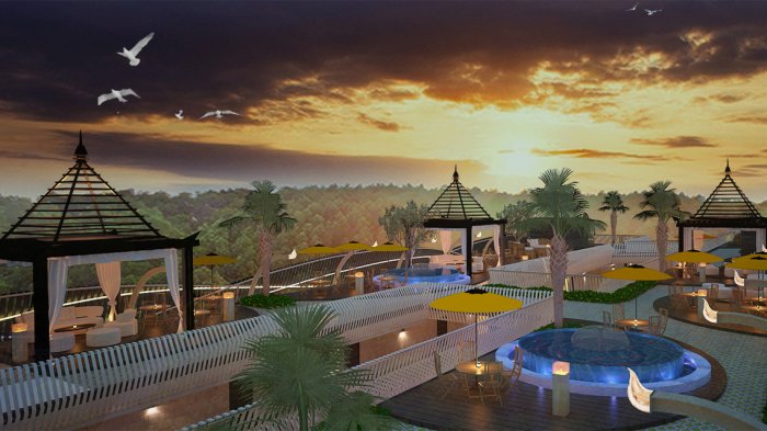 Di lantai puncak itu terdapat restoran, bar, serta infinity pool.