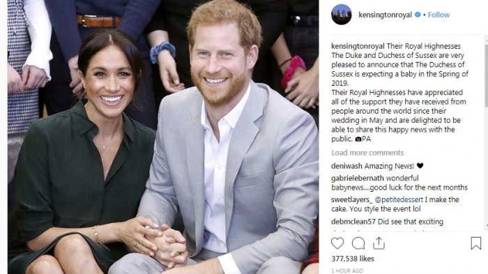 “Duke dan Duchess of Sussex sangat bahagia untuk mengumumkan bahwa Duchess of Sussex sedang menanti kelahiran bayi pada musim semi 2019, Yang mulia sangat mengapresiasi dukungan yang mereka dapatkan dari masyarakat seluruh dunia sejak pernikahan mereka di bulan Mei dan dengan senang membagikan kabat bahagia ini kepada publik," tulis @kengshintonroyal