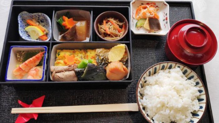 Kemudian ada makanan inti yang terdiri dari nasi, sup miso, kinpira gobo atau salad dengan wijen, kohanu manasu dan lemon atau acar, daikon nimono dan sayur pelengkap alias sayuran rebus dengan saus, sushi neta dan udang besar, acar yang direndam konbu, dan set ikan, telur, bangkuang, wortel.