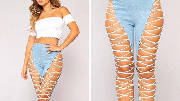 Celana berwarna nude ini memiliki desain yang cukup unik.