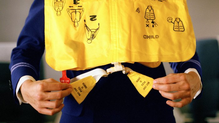 Penumpang harus ingat untuk tidak mengembang jaket pelampung mereka di dalam kabin, seperti yang diperintahkan pramugari dalam demonstrasi keamanan.