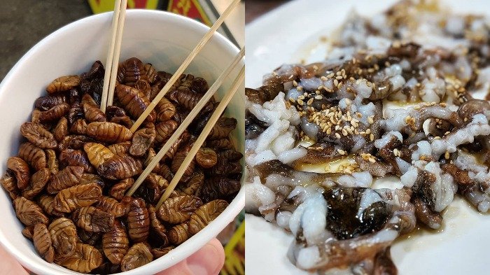 Kuliner yang satu ini terbuat dari kepompong ulat sutera yang dimasak dengan berbagai bumbu.
