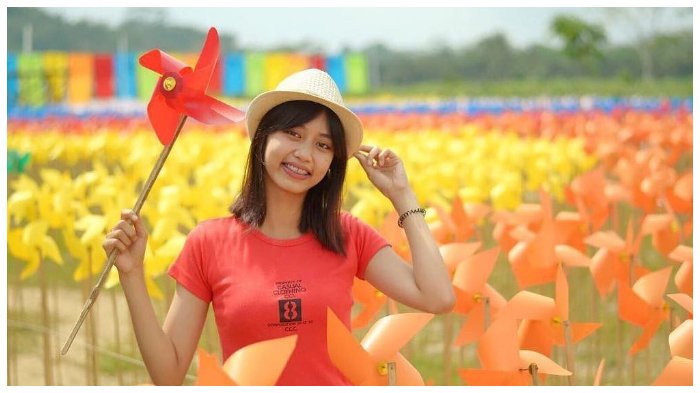 Puluhan ribu kincir angin berwarna-warni berdiri tegak di hamparan taman bunga yang asri.