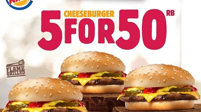TRIBUNTRAVEL.COM - Promo murah Burger King Indonesia, lima porsi Cheeseburger cuma Rp 50 ribu saja, simak yuk cara mendapatkannya.