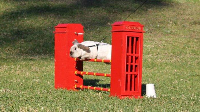Rabbit Hopping Festival menampilkan kelinci-kelinci kecil yang melompati rintangan sementara pemilik mereka memberi tanda pada tali.
