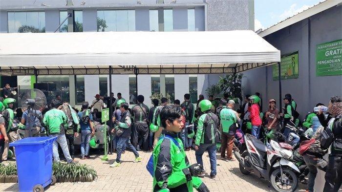 TRIBUNTRAVEL.COM - Para driver ojek online dari Grab berkumpul di depan kantor dan mengantre masuk menuju kantor Gojek Kemang Timur, Jakarta Selatan, Jumat (16/11/2018).