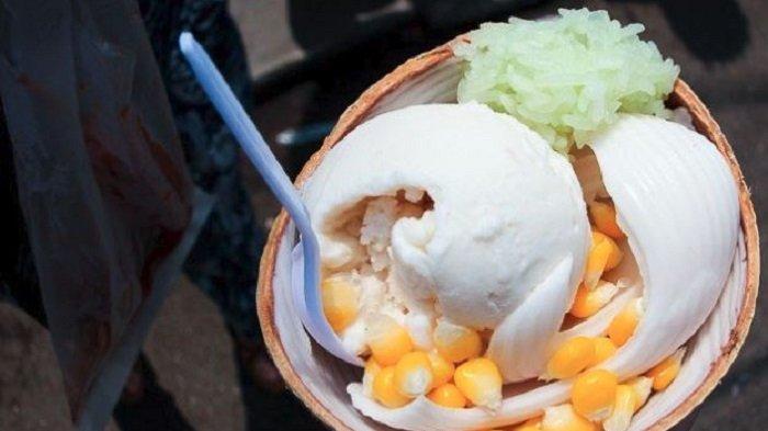 Sajian es krim ini cukup unik dengan wadahnya yang berupa batok kelapa.