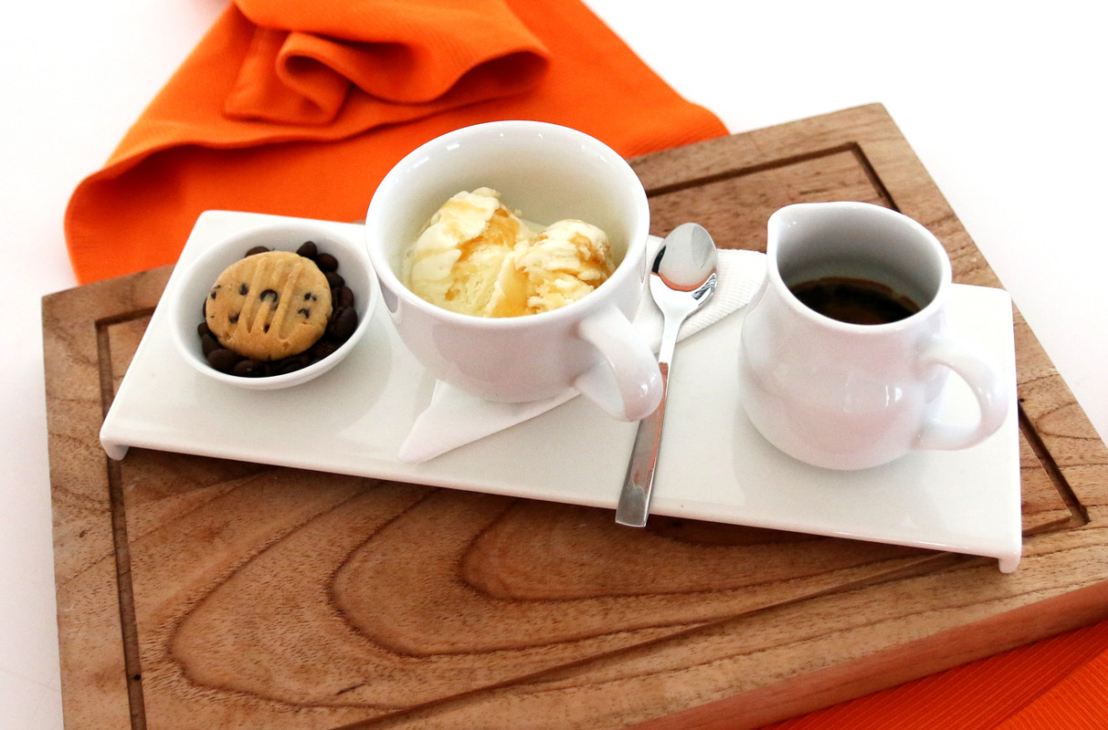 Sepaket hot espresso lengkap dengan dua scoops vanilla ice cream disiram topping sirup caramel dan juga almond cookies yummy.