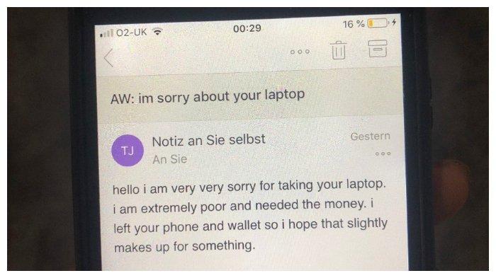 Dalam email tersebut, pencuri laptop menulis surat dengan mengatakan bahwa dia sangat menyesal karena telah mencuri laptop.