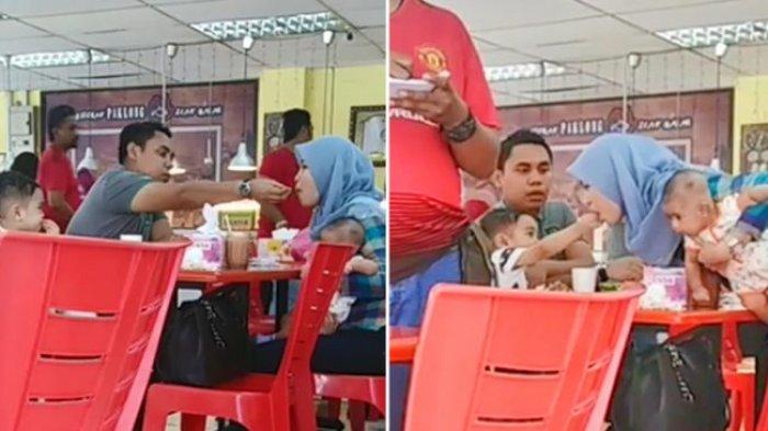 Dalam video yang diambil dan diposting oleh pengguna Instagram Sharimi Shaharudin, seorang pria dengan penuh kasih memberi makan istrinya yang sibuk menggendong bayi mereka.