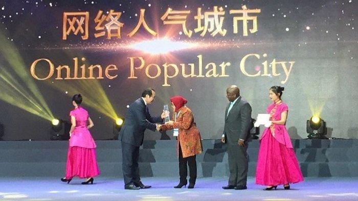 Wali Kota Surabaya, Tri Rismaharini menerima penghargaan Online Popular City award from @GuangzhouAward 2018.
