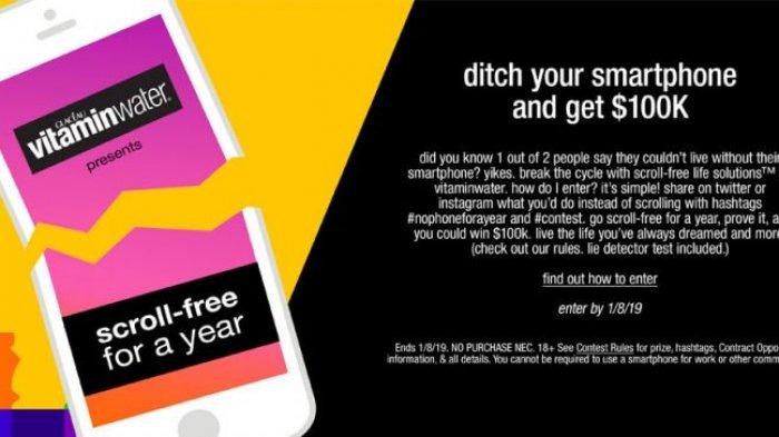 Tidak hanya itu, Vitamin Water juga menawarkan hadiah hiburan sebenar 10 ribu dolar atau setara Rp 140 juta bagi mereka yang terpilih dan mampu hidup tanpa ponsel selama 6 bulan.